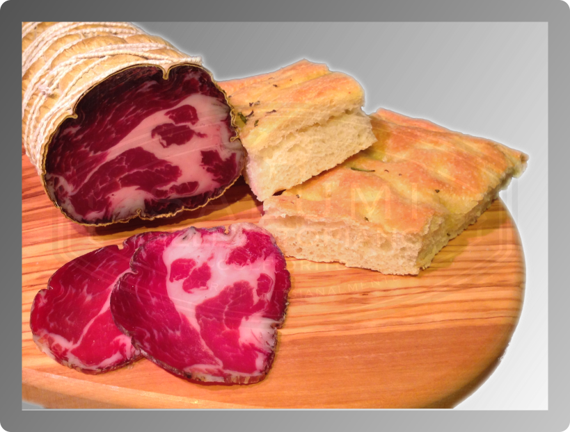 Pregiato salume ottenuto dal collo disossato del suino, stagionato in più di quattro mesi. Durante la salatura con spezie ed aromi naturali insieme alla caratteristica marezzatura di grasso, ne fanno un prodotto dal gusto appetitoso e morbido. Di sicuro è il prodotto che meglio riassume tutte le caratteristiche qualitative e territoriali della nostra Produzione.