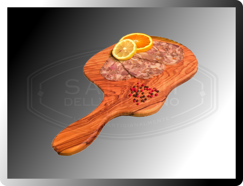 Eccellente tipicità locale, ricavata dalle carni della testa del suino che, insieme a cotenna, ritagli di colli e lonze vengono opportunamente aromatizzate e cotte, successivamente sminuzzate manualmente e insaccate. Puo’ essere consumata gia’ dal giorno successivo senza bisogno di stagionatura.